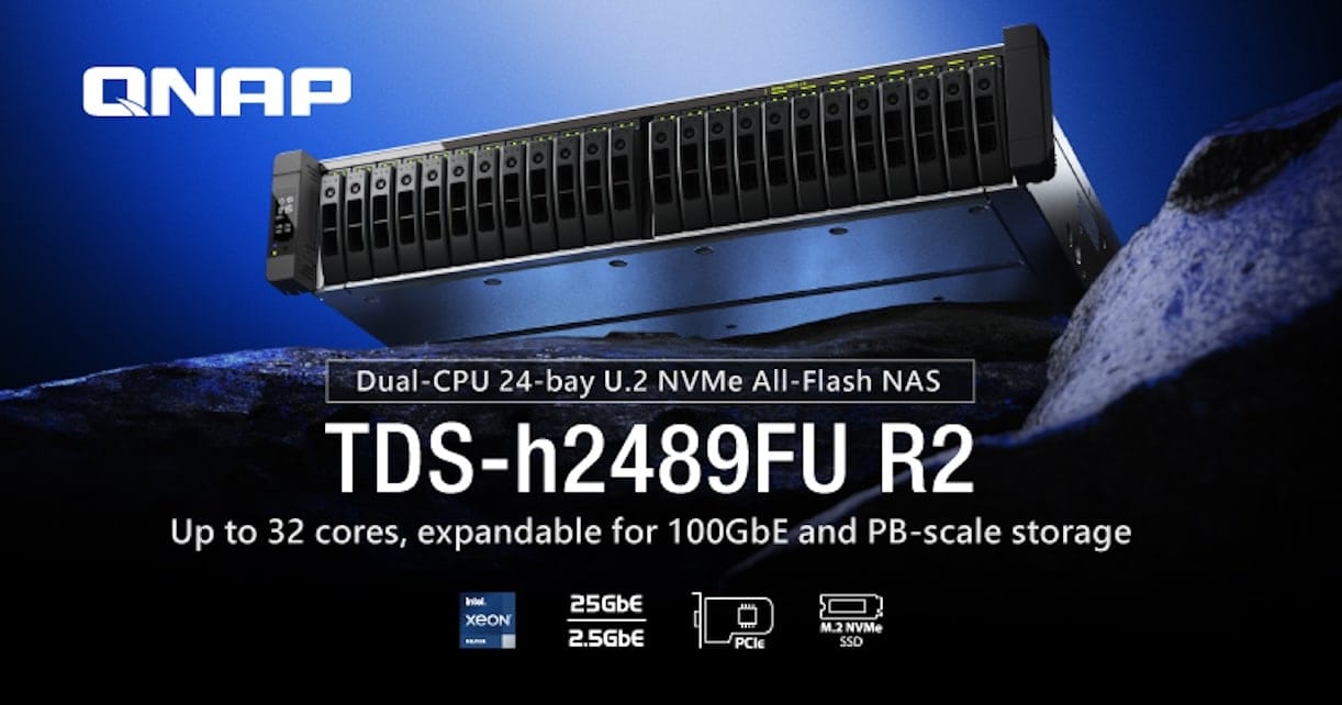 QNAP® Systems, Inc. has unveiled its latest technological gem for high-performance enterprise environments: the TDS-h2489FU R2, an all-flash NAS system with 24 bays supporting NVMe U.2 drives, dual Intel® Xeon® processors, and a range of features designed for data centers, advanced virtualization, AI model training, VDI, and data-intensive storage.